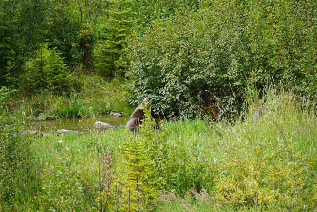 Vanochtend toch maar een uurtje later met de stoeltjeslift naar boven om Bo de Grizzly te bewonderen. We hebben geluk! Hij neemt net een “bad” in zijn zelf gegraven poeltje.