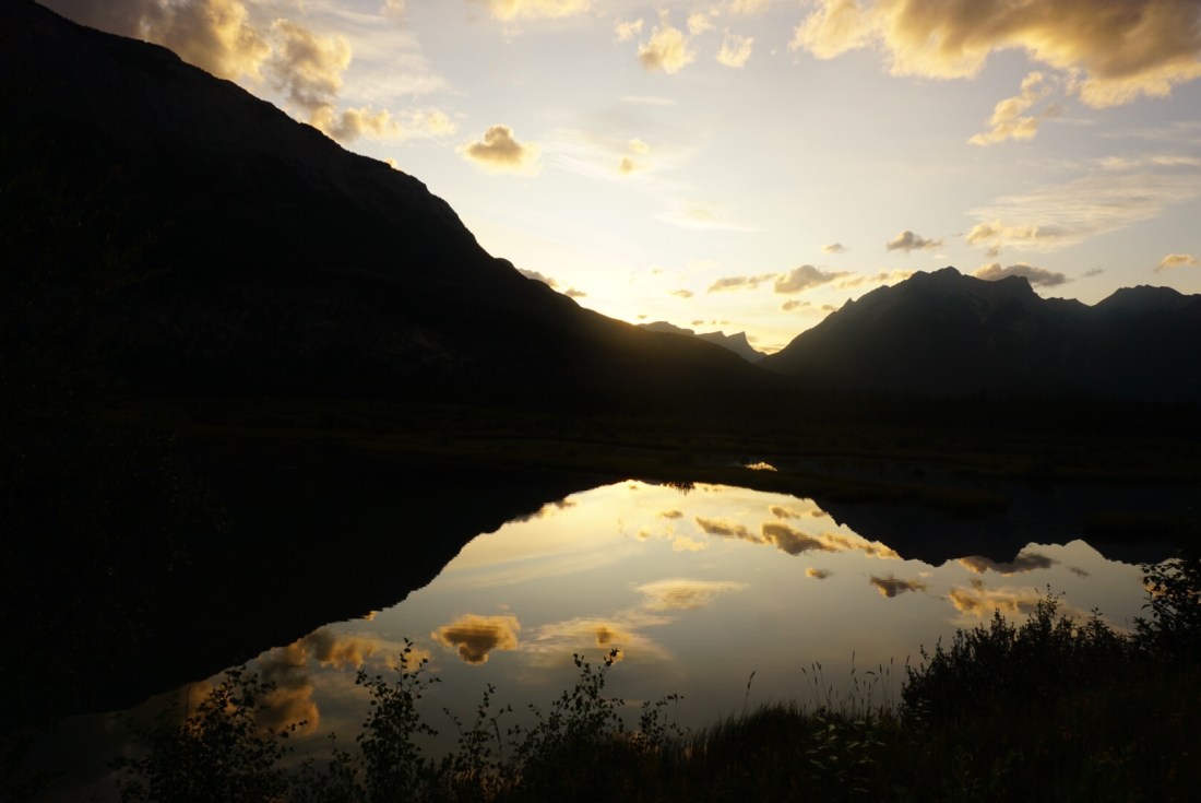 We sluiten de dag af met een weerspiegeling van bergen en lucht in een klein meertje dichtbij ons Hotel Chateau Jasper. Een chique onderkomen met zwembad, hot tub en mooie ruime kamer met open haard.